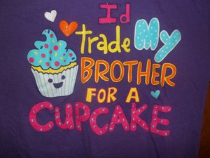 She was as cute as a button (I don’t know how that saying came about, but I have heard it all my life). She couldn’t have been more than three years old as she stood in front on me ignoring the basketball game behind her and eating her candy. I was immediately drawn to her because I have a little great-granddaughter about the same age and size. But the thing that brought a smile to my face was the T-shirt she was wearing. It said, “I will trade my brother for a cupcake.”